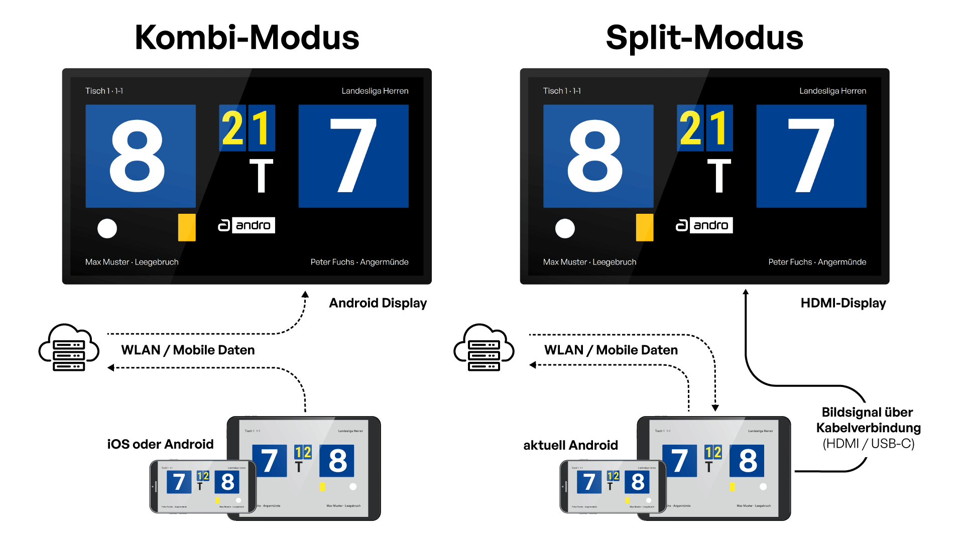 Im Kombi-Modus arbeiten zwei Geräte zusammen: eines dient zur Eingabe der Spielstände, das zweite zeigt ausschließlich die Scoreboard-Ansicht. Beide Geräte werden über WLAN/Internet verbunden und in Echtzeit synchronisiert.